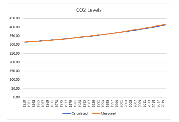 Here are the calculated levels using that deterministic function compared with the measurements reported by the climatologists at Mauna Loa.
