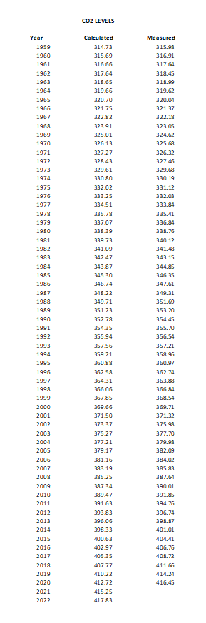 CO2 = 59.25 x e^(.016 (t-1959) + 255.48